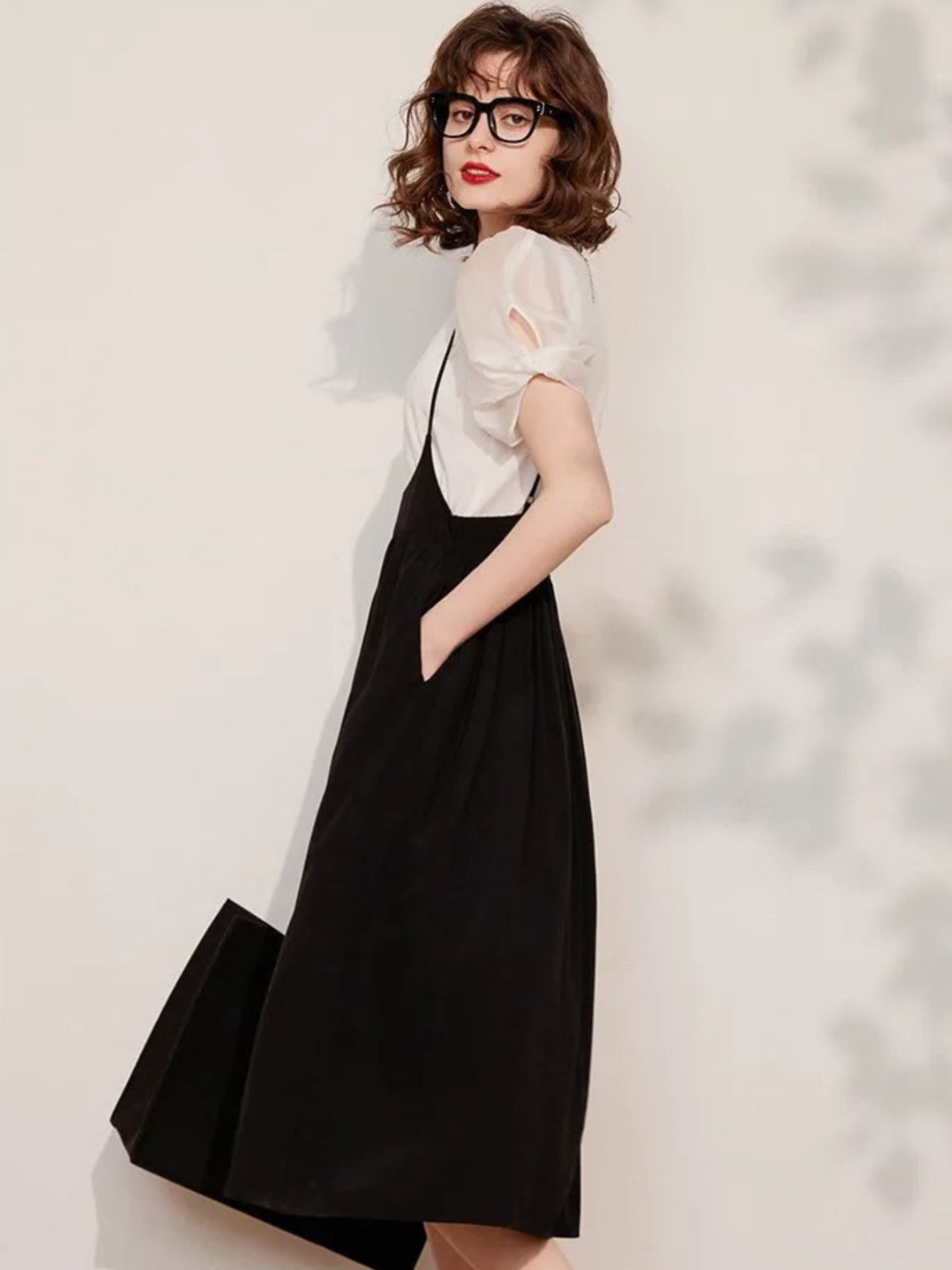Suspender Dress Set with Puff Sleeve Blouse - Coralie